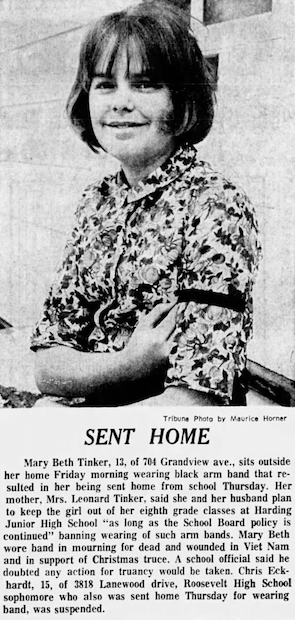 In December 1965, Des Moines, Iowa, high school student John Tinker, his 13-year-old sister Mary Beth, and John's friend Christopher Eckhardt decided to protest American involvement in the war by wearing black armbands to school. John had previously attended a war protest in Washington, D.C., and Eckhardt's family was part of an anti-war group, which inspired them to organize a meeting for students interested in joining the protest. However, Des Moines' school administration heard about their plans and banned wearing armbands, making some hesitant to participate.