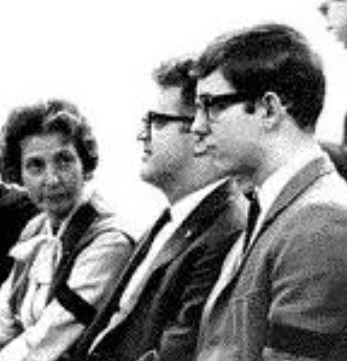 "Chris Eckhardt with his mother, Maggie and father, Bill attend the School Board meeting after we were suspended." (Tinker Tour, 1965)