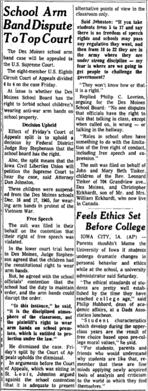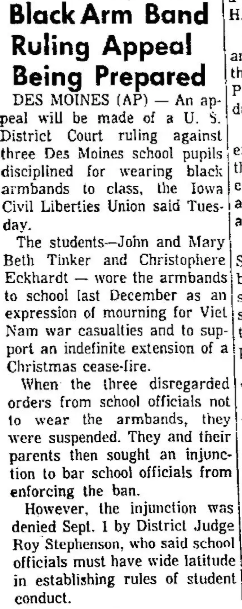 In September 1966, the Federal District Court heard the case and sided with the school, ruling that the armbands disrupted other students’ learning, thereby justifying the ban and the students’ suspension. The Tinkers disagreed with the ruling so they decided to appeal the case.