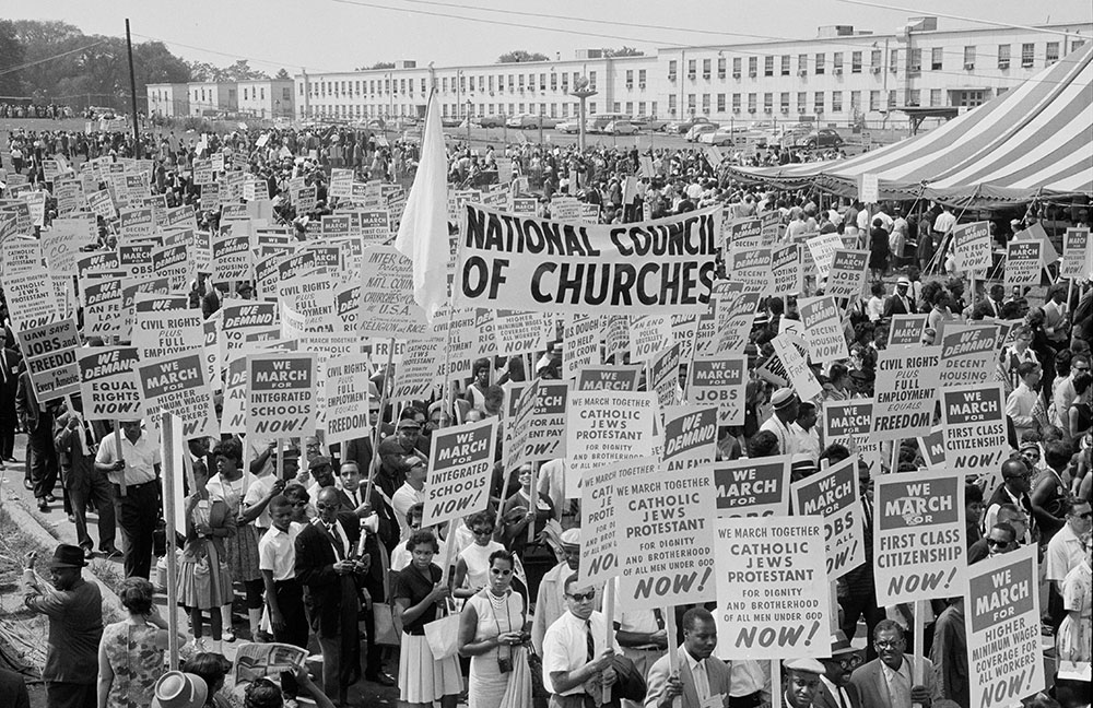 "A banner for the National Council of Churches is seen among hundreds of signs carried by participants in the March on Washington for Jobs and Freedom Aug. 28, 1963"
