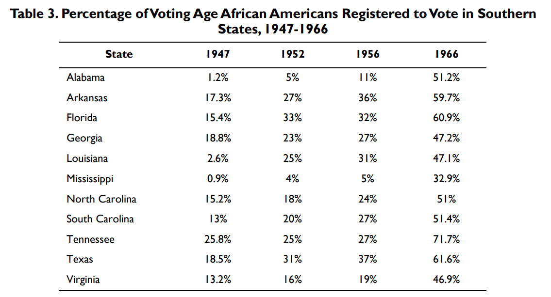 "Percentage of Voting Age African Americans Registered to Vote in Southern States, 1947 - 1966"
