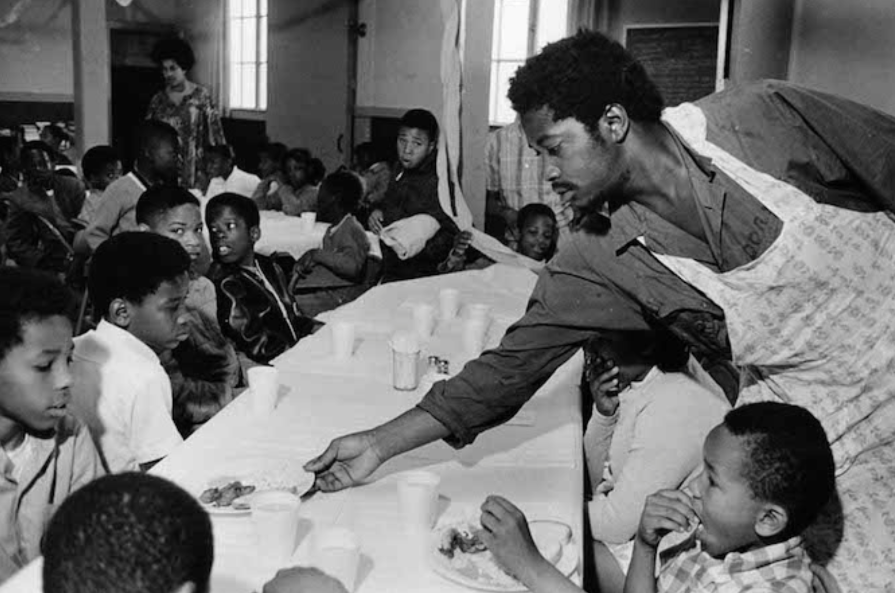 "A Panther serving breakfast to a group of youngers. Billy X Jennings, a former Panther who now serves as the party’s archivist, worked at the original breakfast program at St Augustine’s. “Every office was required to send two people to learn how it ran so you can open one in your area,” he said. Jennings would work at St Augustine’s early in the morning before heading to class at Laney College. Soon after, the breakfast service expanded to 23 locations around Oakland"