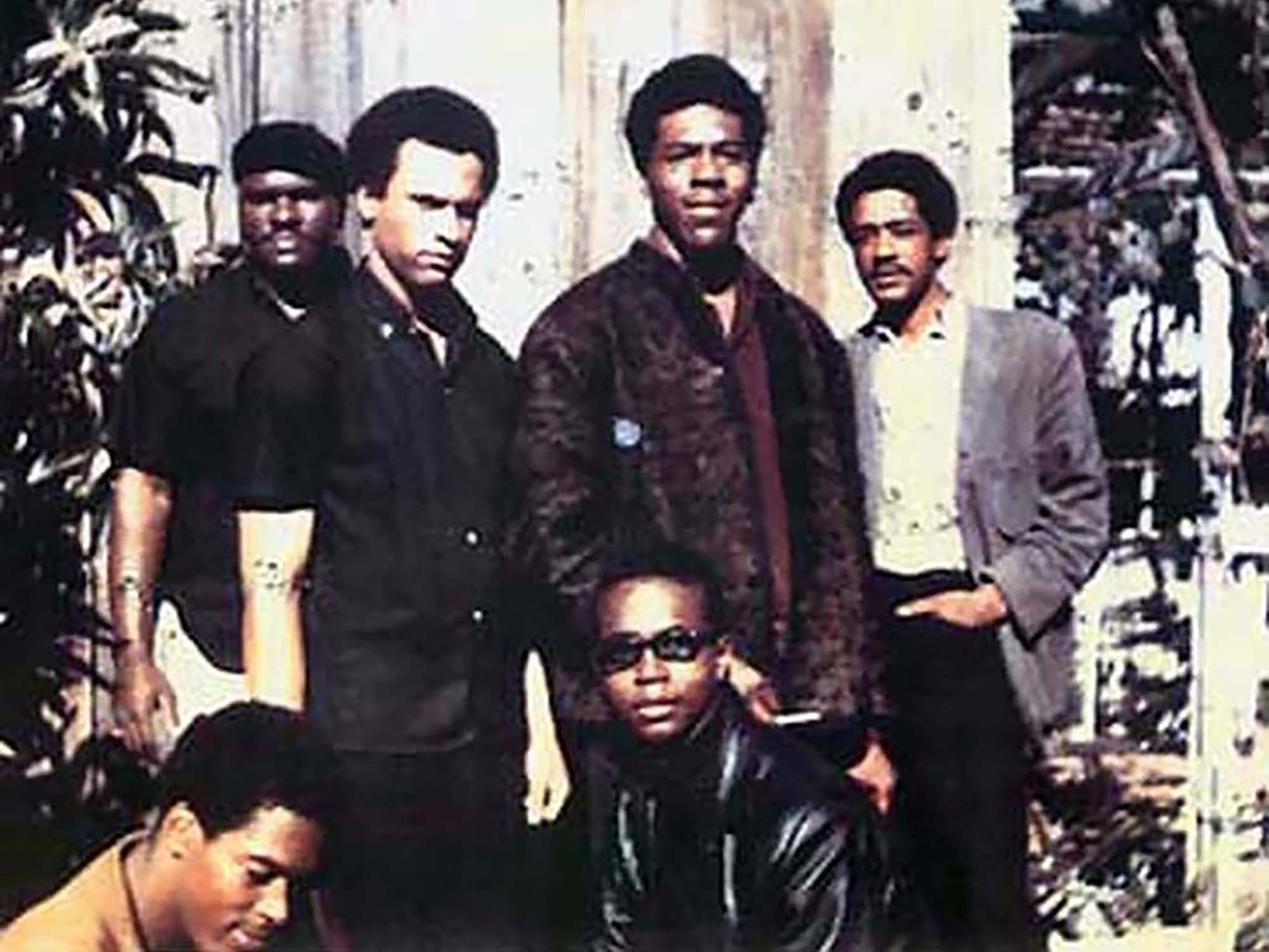 "Original six members of the Black Panther Party (November, 1966) Top left to right: Elbert "Big Man" Howard; Huey P. Newton (Defense Minister), Sherman Forte, Bobby Seale (Chairman). Bottom: Reggie Forte and Little Bobby Hutton (Treasurer)."