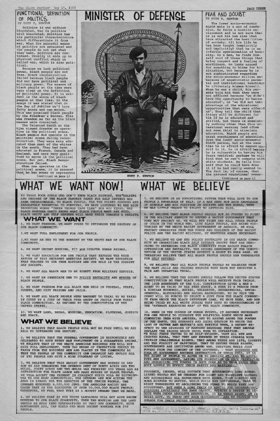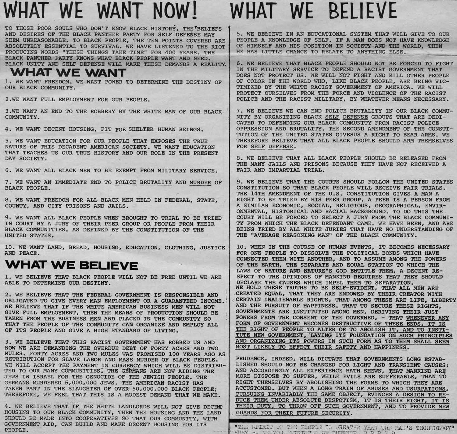 On October 15, 1966, the Black Panther Party drafted their Ten-Point Program, which established their goals and direction. This program called for support and resources from the government and those who have played a role in perpetuating violence against the black community, as they struggle to survive day to day.