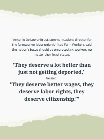 “Immigrants make up about two-thirds of the nation’s crop farmworkers, according to the U.S. Department of Labor, and roughly 2 in 5 of them are not legally authorized to work in the United States.”