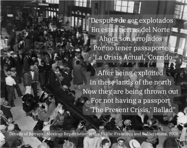 The Mexican Repatriation coincided with the Great Depression and is an incredibly consequential hidden history concerning the rights of immigrant laborers. Examples like the betabeleros of Michigan show us how immigrants’ rights were ignored and the government’s responsibility to protect workers who contributed to its economy was disregarded. The same disregard for the rights of immigrant laborers and the government's evasion of its responsibility to these workers continues today.