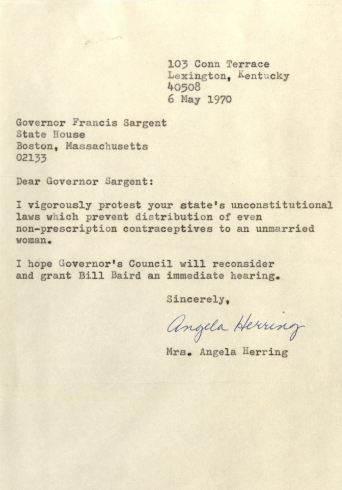 "I was part of the 1967 action at Boston University by birth control activist Bill Baird to challenge the law forbidding birth control for single people. By prearrangement a few of us women students took condoms and foam from him in a big auditorium full of witnesses in an act of civil disobedience. Baird was arrested, and he took that case all the way to the Supreme Court." ~ Sue Katz, Women's Liberation Explosion at BU