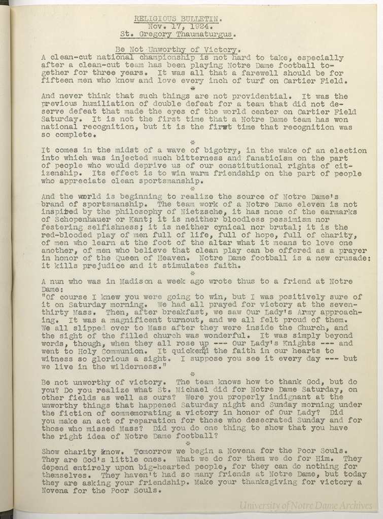 The riot still influences the University of Notre Dame because today most Notre Dame students live on campus and not in the city of South Bend, thanks to dormitories that Matthew Walsh had built to keep his students away from bad influences in the city of South Bend after the riot (Tucker 212). In addition, because of the circumstances of when the Notre Dame football team rose to power, the team stands for all Catholics and is seen as Notre Dame's stand against anti-Catholicism (Tucker 189). Even today, a century later, the riot is still being written about, from Todd Tucker's book to the Indiana Historical Society's exhibit on the riot.