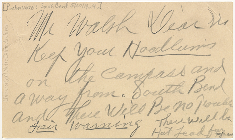 (Personal letter to Matthew Walsh, the president of Notre Dame, warning of hot lead)
