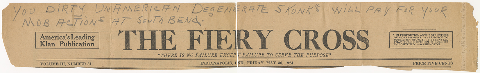 The May 17-19, 1924 Notre Dame riots against the Ku Klux Klan were revolutions to ensure that the Klan would not take control of South Bend ("Klan Display..." 1). Since this happened, the Klan's activity in the South Bend area became limited (Nevel 89). Although negative reactions followed it, the riot proved that anti-Klan forces existed at a time when many people were pro-Klan.