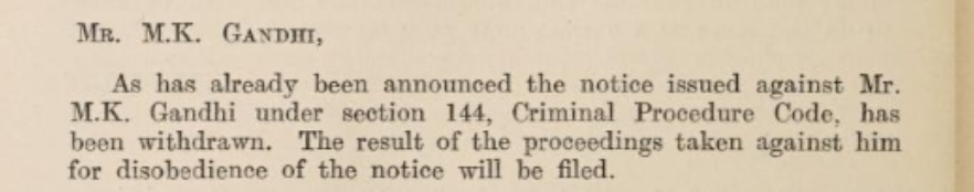 “Your presence in any part of the District will endanger the public peace and may lead to serious disturbance...loss of life…therefore I do hereby order you to leave by the next available train” -W.B Heycock District Magistrate Champaran to M.K Gandhi (Prasad 107)