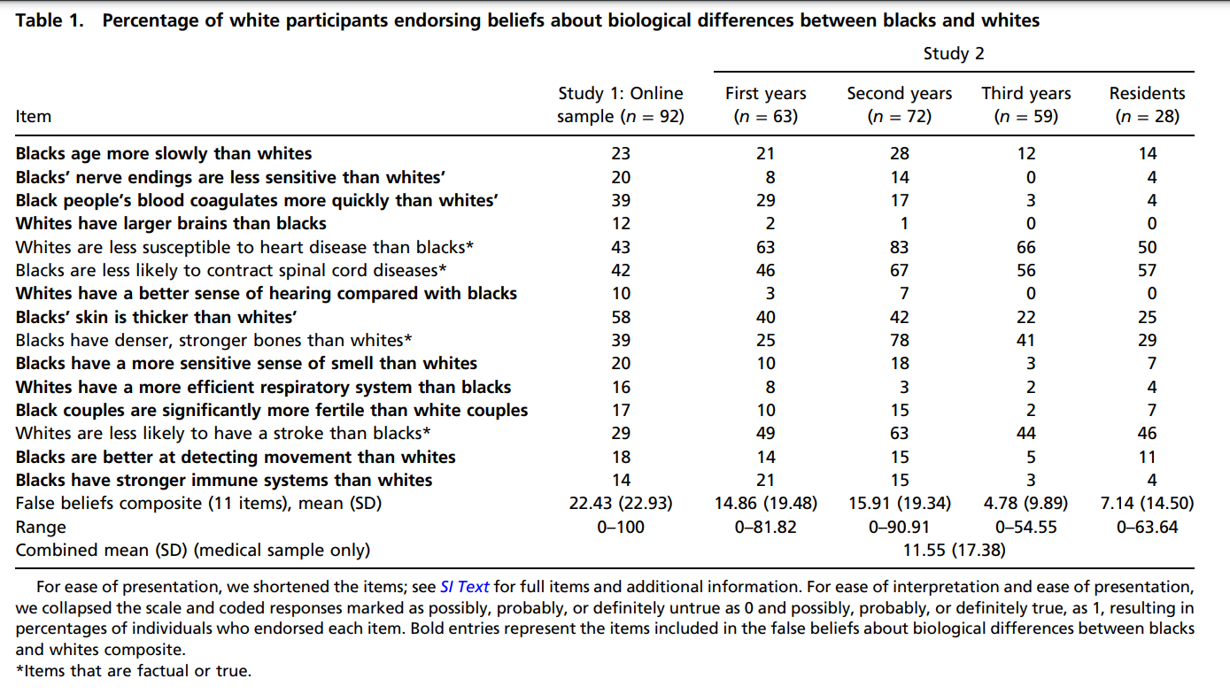 PNAS. "Table 1. Percentage of white participants endorsing beliefs about biological differences between blacks and whites." 1 March 2016. Racial bias in pain assessment and treatment recommendations, and false beliefs about biological differences between blacks and whites
