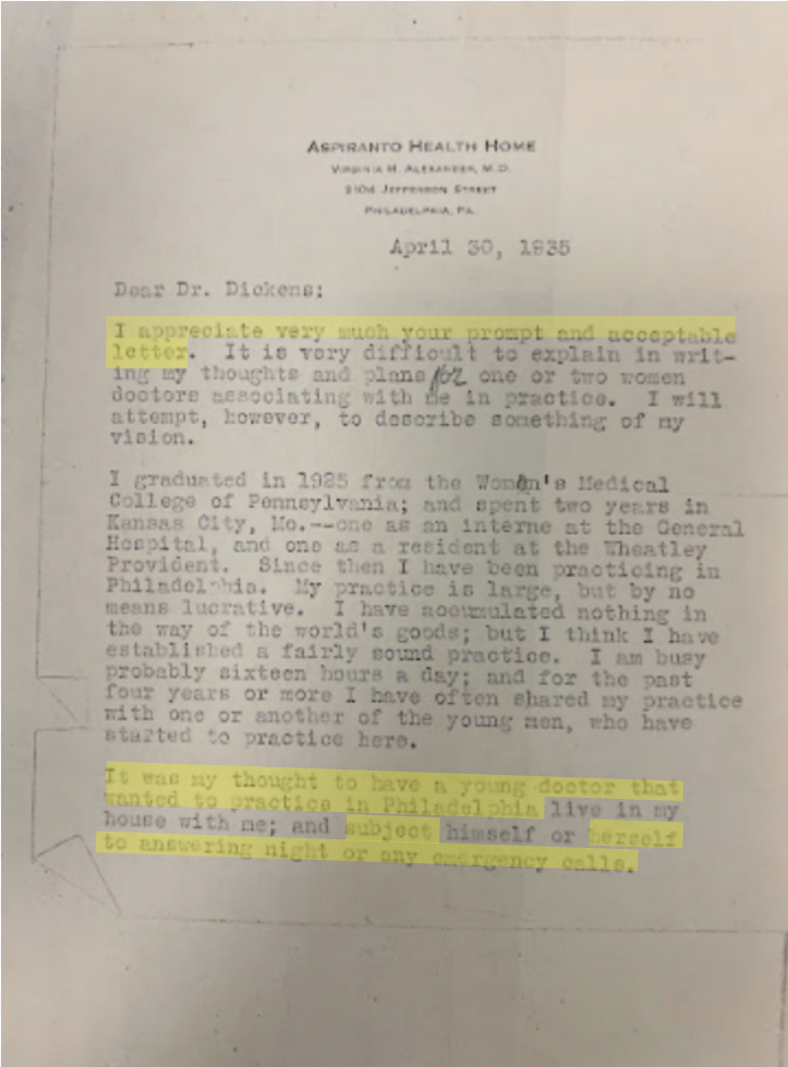 "Letter to Dr.Dickens by Virginia Alexander (1935) p1." Virginia Margaret Alexander Papers, University of Pennsylvania Archives
