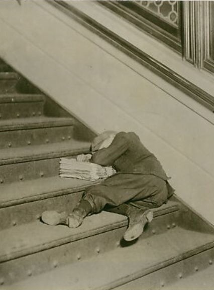 "Newsboy asleep on stairs with papers." (Hine, The Metropolitan Museum, February 1912).