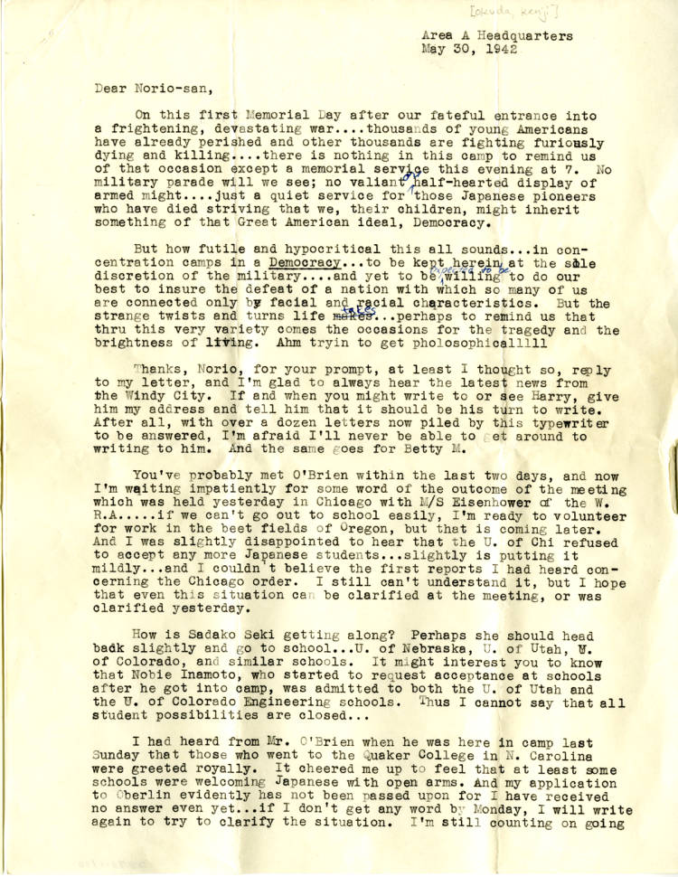 "Kenji Okuda letter to Norio Higano from Camp Harmony the Puyallup assembly center regarding his feelings on internment on Memorial Day", May 30, 1942, University Libraries | University of Washington.