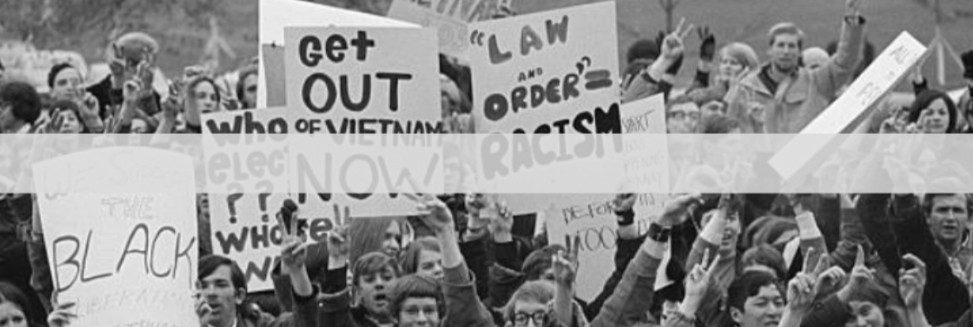 "Participants in a Students for a Democratic Society-sponsored demonstration display signs protesting the general election as a "hoax" and calling for peace in Vietnam." Getty Images/Bettman Archive