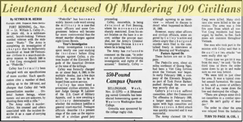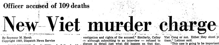 “The story did not break in the press until reporter Seymour Hersh got a story on it published in thirty U.S. papers on November 13. Hersh’s first article gave an overview of the charges against Lieutenant Calley of murdering 109 Vietnamese civilians, and discussed what was known of the incident.