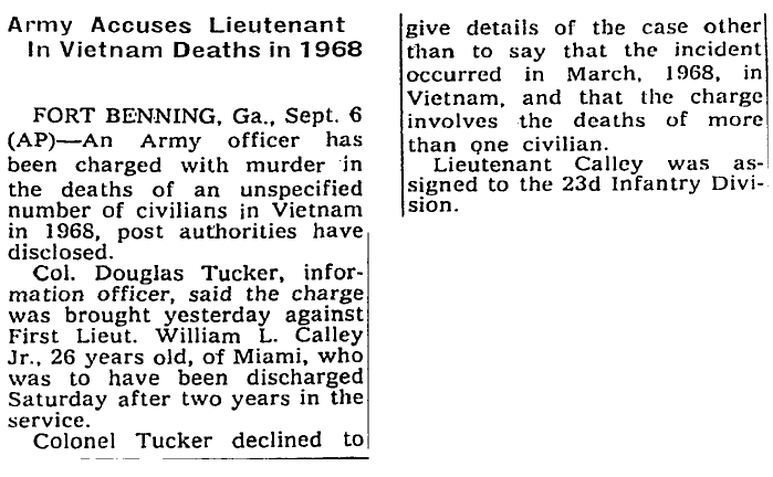 “Army Accuses Lieutenant In Vietnam Deaths in 1968” The New York Times/Associated Press