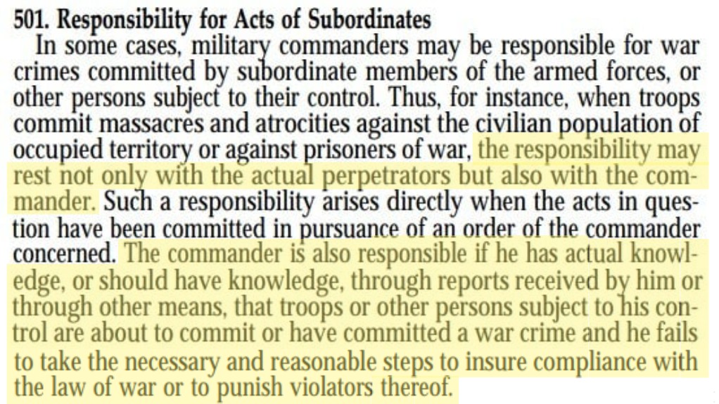 "General Peers does make it clear that the Military Assistance Command Vietnam had issued appropriate directives concerning the training of troops in the provisions of the Geneva Conventions of 1949 on the Protection of Civilian Persons, on the safeguarding of noncombatants and private property and on the reporting and investigation of war crimes. The directives and the machinery were there, but they were unavailing when individuals disobeyed them and lied and distorted the facts."