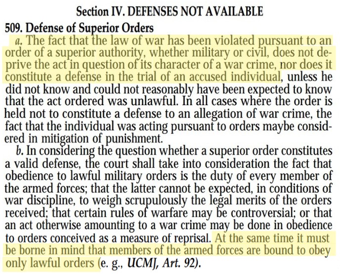 Soldiers were required to follow lawful orders, but also obligated to disobey unlawful ones. Therefore, subordinates should be held responsible for their actions.