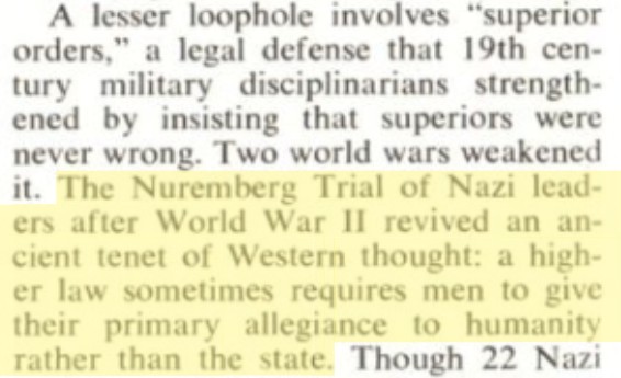 At the heart of this defense lay disturbing similarities with the Nuremberg Trials, which established an idea that, regardless if a soldier took direct initiative or followed orders, he remains culpable for his actions.