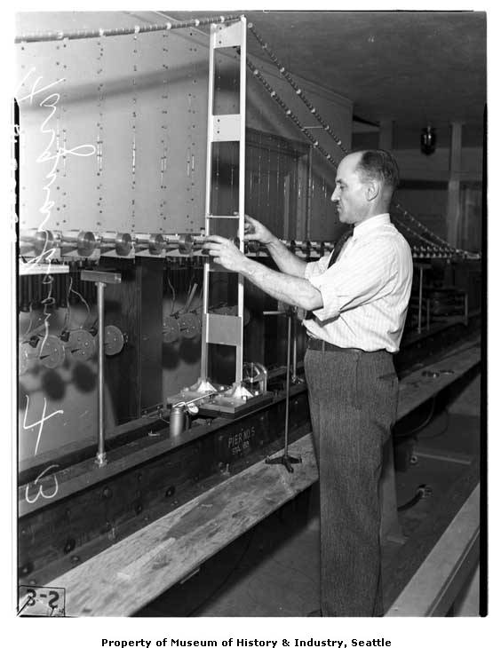 "Engineer with model of Tacoma Narrows Bridge", September 1940