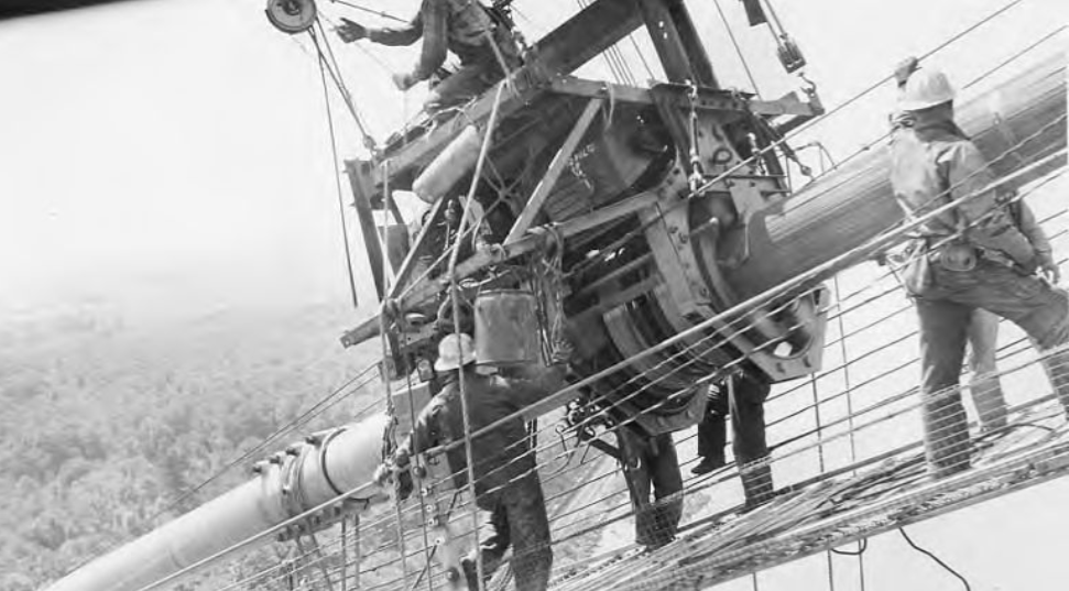 "Workers on catwalks using a hydraulic press to compact the main cable into a cylindrical shape, Tacoma Narrow Bridge construction, probably 1950", University of Washington Libraries