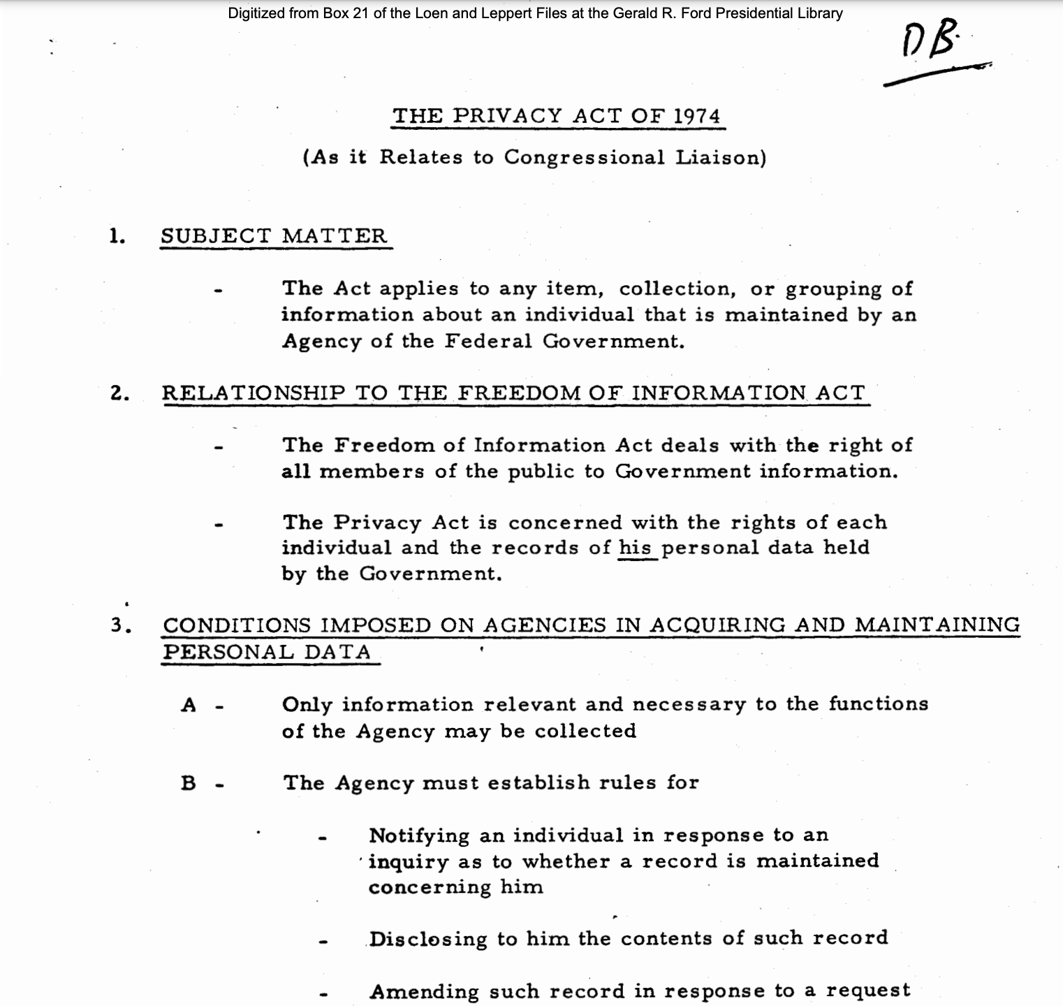 First page of the Privacy Act, 1974, Ford Library Museum
