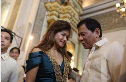 “President Rodrigo Duterte talks to Imee Marcos at a wedding ceremony in Manila, September, 2016” (Sanchez)