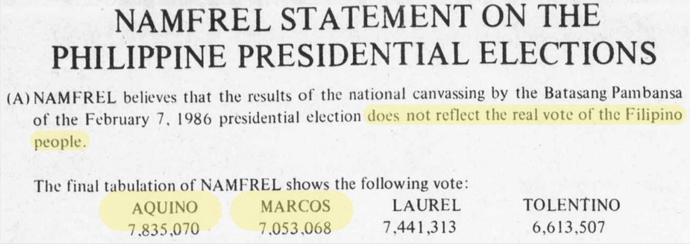Although Marcos was declared the winner by the government's COMELEC (Commission on Elections), data gathered by volunteer organization NAMFREL found that Aquino won by about 800,000 votes (Sanchez).