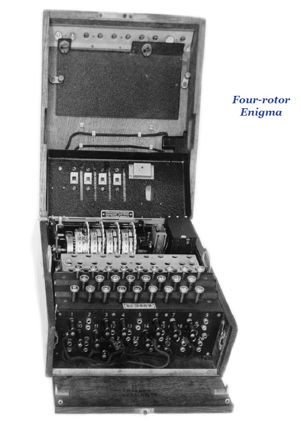 “[T]he Germans believed their forces had been spotted by the aircraft, not given away by Enigma. [German] Admiral Doenitz, however, was not satisfied. He intended to change the U-boat Enigma machines. He could not radically alter the machine itself as it had to continue to work with the rest of the German Navy. His change added a thin fourth rotor between the leftmost rotor and the reflecting plate. When necessary, the rotor could be set in a straight-through position, enabling it to act as a three-rotor machine.”