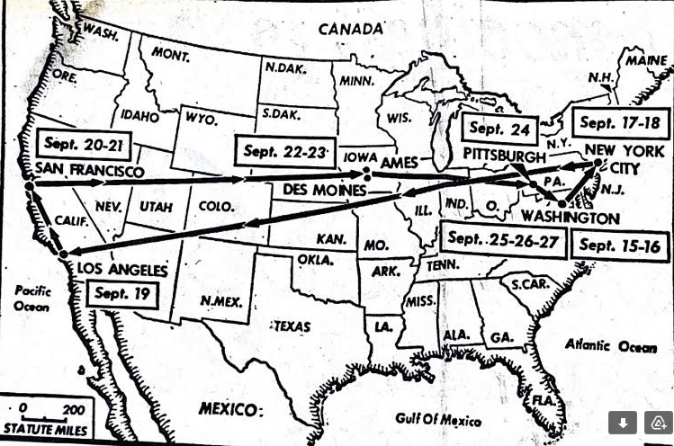 "Coast-to-coast and back routes indicated will be taken by Soviet Premier." (Rochester Times Union, 24 Aug. 1959)