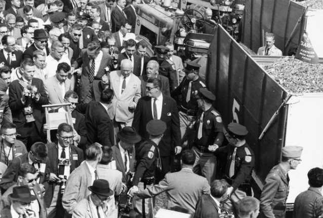 "Elevated view of Soviet Premier Nikita Khrushchev wading through a throng of reporters during a visit to a farm." (Wisconsin Historical Society, 1959)