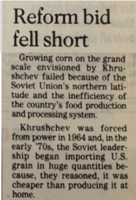 "Nikita Khrushchev began the process that turned Russia from an agriculturally backward nation that for many years couldn't feed itself, into a nation that today is the third largest exporter of grains behind the U.S. and western Europe."