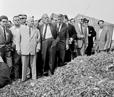 "American farmer Roswell Garst hosts the head of the Communist Party of the Soviet Union Nikita Khrushchev on his farm during a visit of the latter to the USA." (Yegorov, TASS Russian News Agency, 23 Sept. 1959)