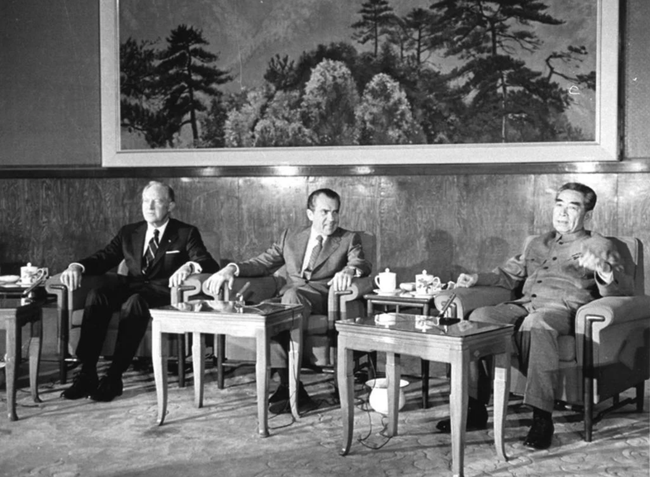 "President Nixon and Premier Zhou Enlai meet in Peking, February 21, 1972, for the start of talks after Nixon flew from Guam and Shanghai. At left is U.S. Secretary of State William Rogers." AP Photo