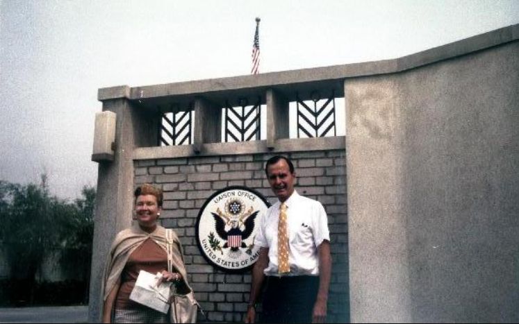 "Chief of US Liaison Office to China, George Bush, in front of the Liaison Office with an unidentified woman, circa 1975" George H.W. Bush Presidential Library and Museum