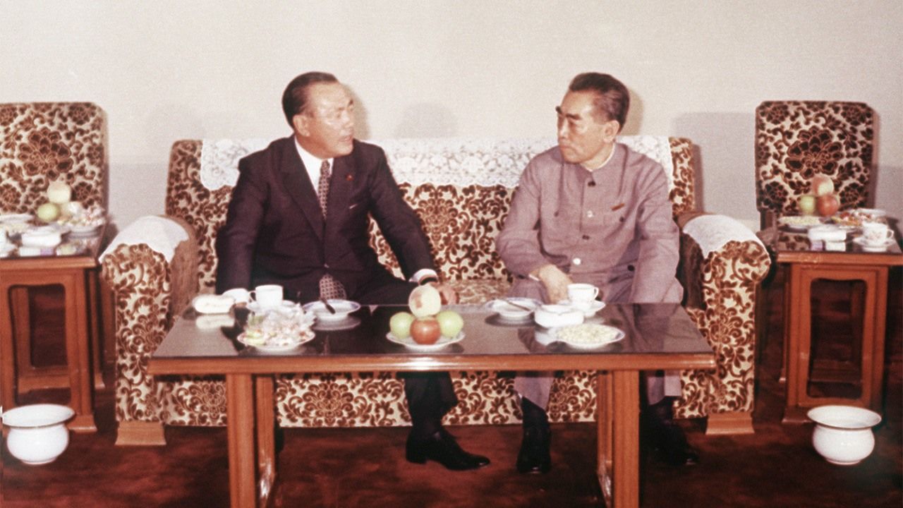 "Prime Minister Tanaka Kakuei (left) and his Chinese counterpart, Zhou Enlai, meet in Beijing for the first Sino-Japanese summit on September 25, 1972." Jiji Press