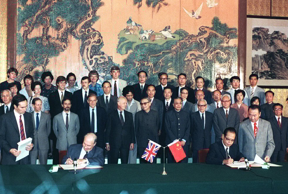 "Zhou Nan, chairman of the Chinese negotiating team, and Sir Richard Evans of the UK sign the draft agreement of the Sino-British Joint Declaration on Sep 26, 1982 in Beijing." P.Y. Tang