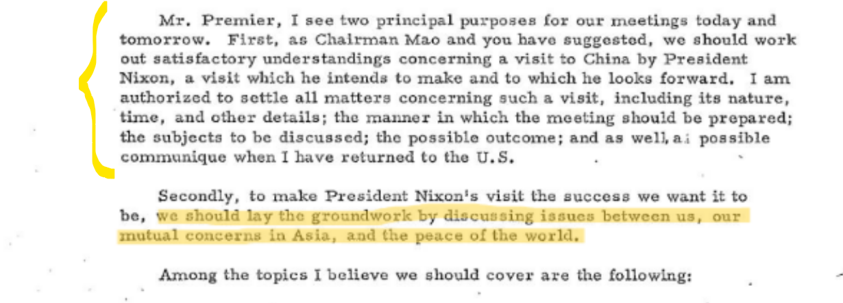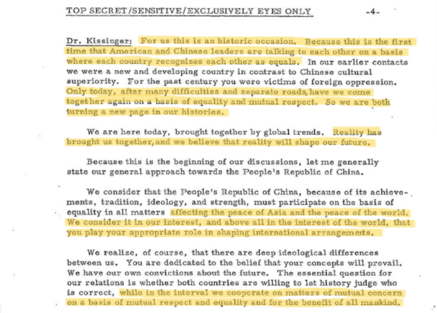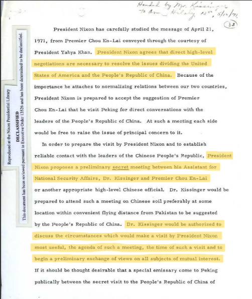 "In July of 1971, Premier Zhou Enlai met with Henry Kissinger, the National Security Advisor to U.S. President, who was on a secret mission to China. Both sides made a public announcement that the U.S. President Richard Nixon would be invited to visit China soon" China.org.cn