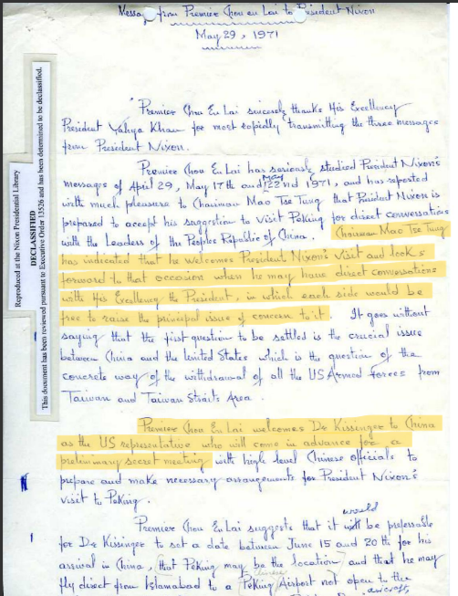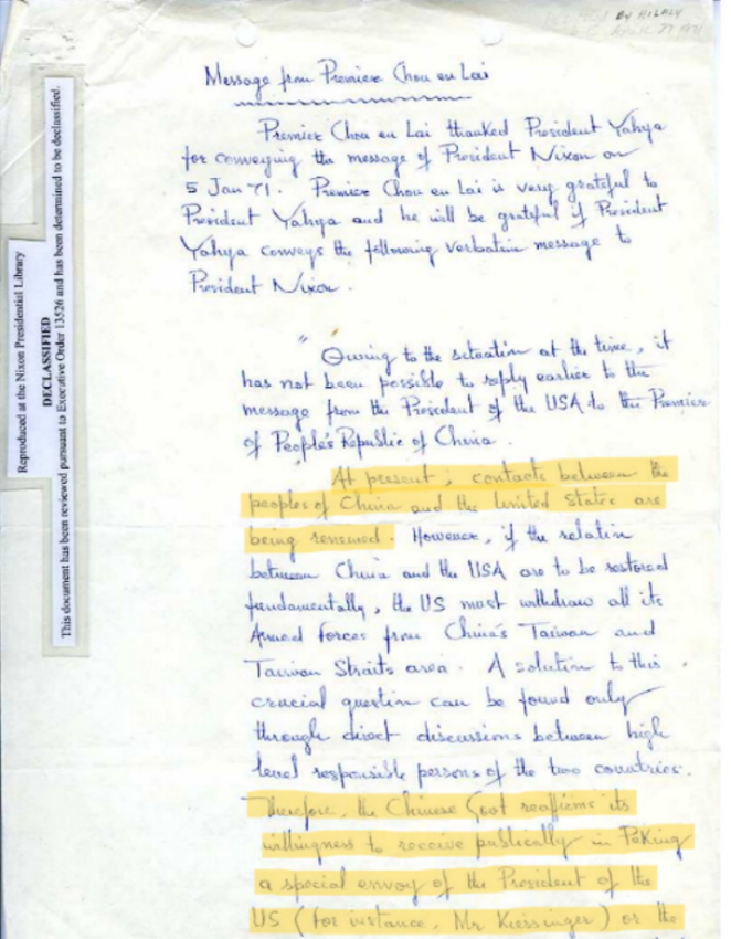 From December 1970 through June 1971, letters were exchanged between Chinese Premier Zhou Enlai and Richard Nixon.