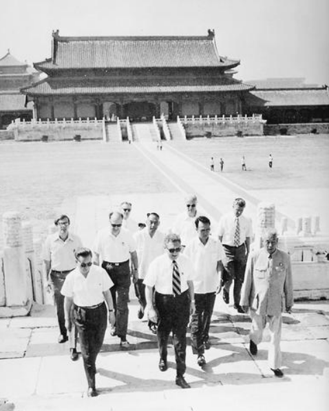 "US National Security Advisor Henry Kissinger tours the Forbidden City in Beijing with the US delegation during Kissinger's secret visit to Beijing in July 1971." The White House Years