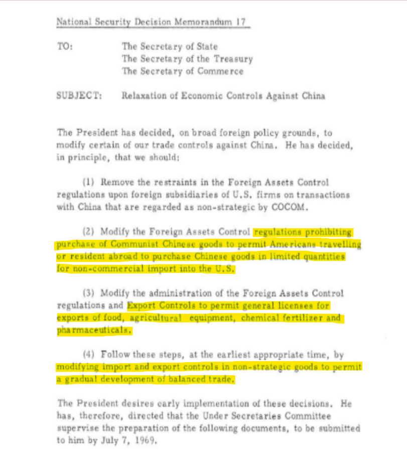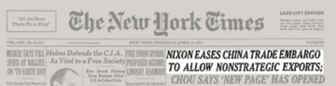 From 1969 through 1971, President Nixon eased most trade and travel restrictions with China, as well as terminating the the U.S-China trade embargo.