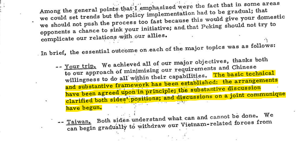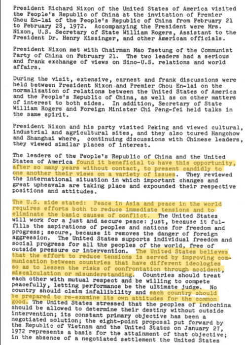 “It also defused tensions over Taiwan through US recognition that the island was part of China and that it was committed to withdraw military forces stationed there once the Communist and Nationalist Chinese had settled their differences peacefully.”