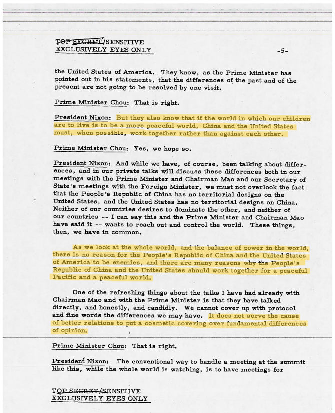 “While our two countries will continue to have differences, it is clear from Dr. Kissinger’s talks with you and Prime Minister Chou Enlai that we increasingly share common views about the world situation. We take great satisfaction in the progress of our dialogue and the specific steps that are now being taken to accelerate the normalization of our relations.”