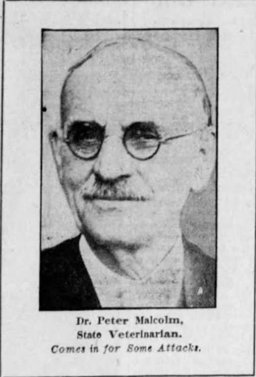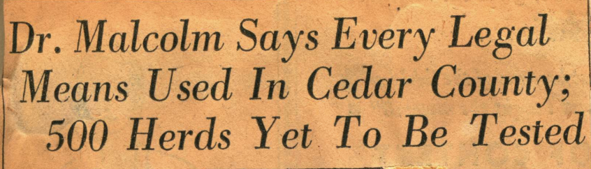 On April 10, 1931, E.C. Mitchell was the first Cedar County farmer who allowed Bovine TB testing by Dr. Peter Malcolm. The following day, when he encountered seventy-five protestors gathered at the farm, Dr. Malcom left and returned with police protection to read test results. When one of Mitchell's bulls tested positive, the crowd provoked a cattle stampede and forcibly threw Malcolm off the farm, which halted test results.