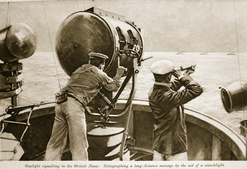 British mariners signaling other ships during the First World War. Morse code was a highly visible way of communication that could be projected to shore or other ships. Britannica Image quest