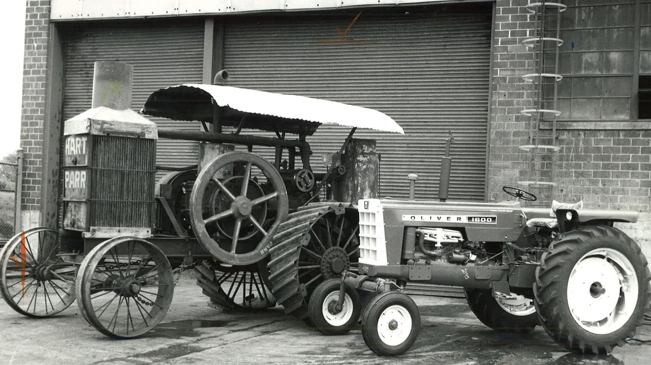 "This 1964 photo shows the progress made in tractors between 1913, when the Hart-Parr '60' was made and 1964, when the Oliver 1600 was built." (Des Moines Register Photo Archive)
