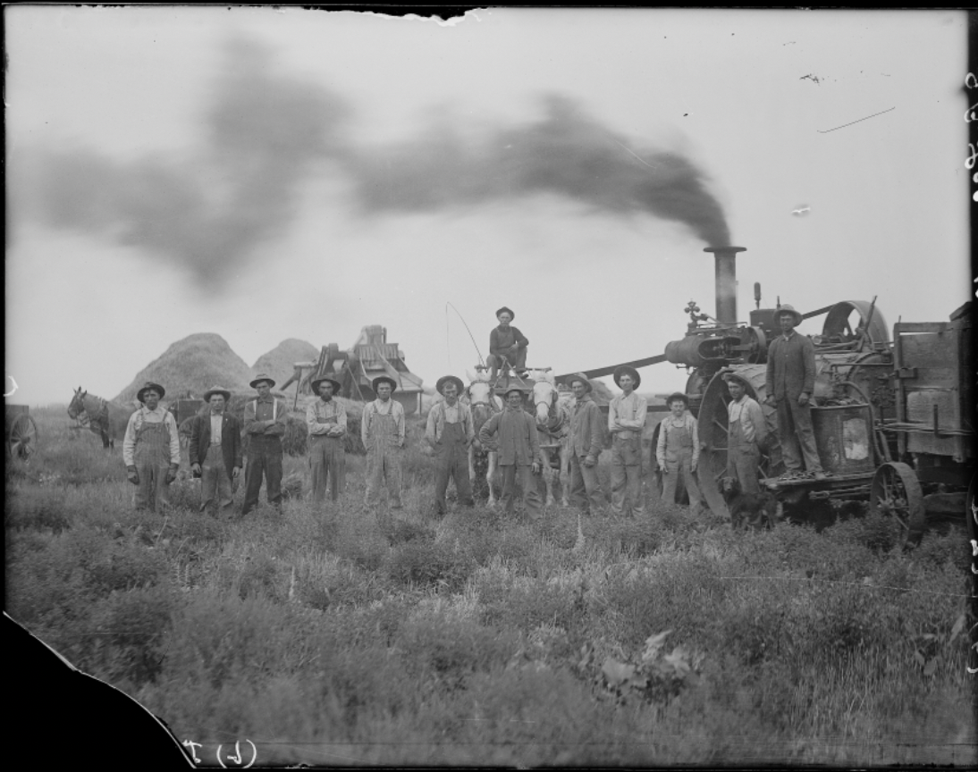 "Farm scene; threshing on J.B. Lee farm north of Shelton, Nebraska, 1910." (Butcher, History Nebraska)