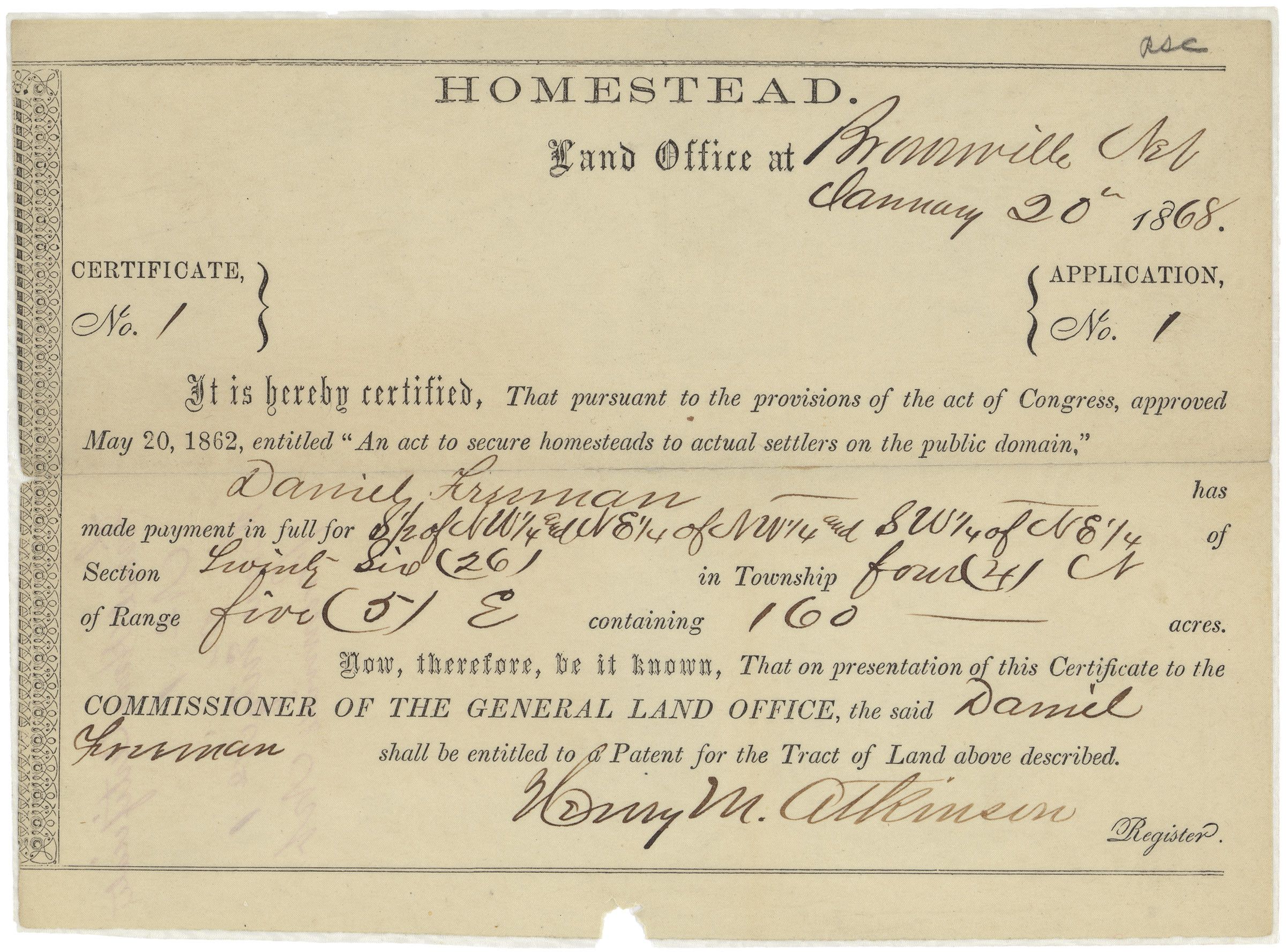 "Daniel Freeman was the first American to file a homestead claim for land under the Homestead Act of 1862. Freeman initiated his claim on January 1, 1863 and received this ownership certificate January 20, 1868." (National Archives)